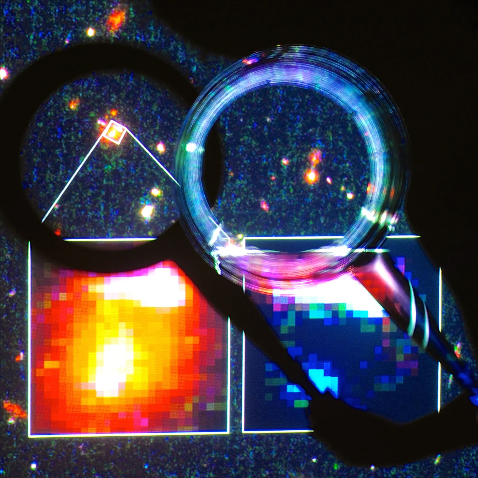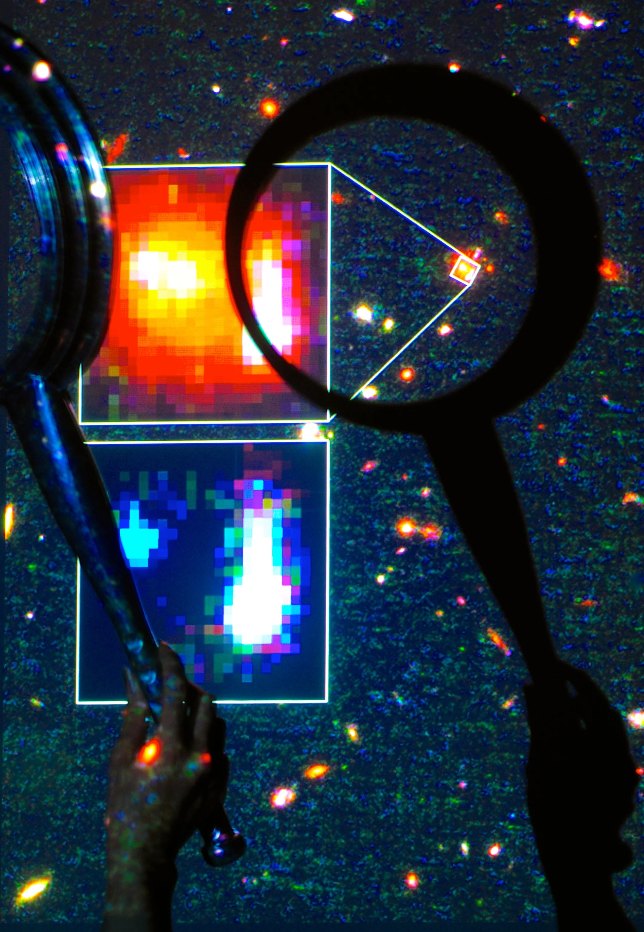 “It’s very difficult to see an alignment between two galaxies in the early universe. Imagine holding a magnifying glass close to you and then moving it much farther away. When you look through a magnifying glass held at arm’s length, the chances that you will see an enlarged object are high. But if you move the magnifying glass across the room, your chances of seeing the magnifying glass nearly perfectly aligned with another object beyond it diminishes,” says Tran in reference to the rarity of the discovery.