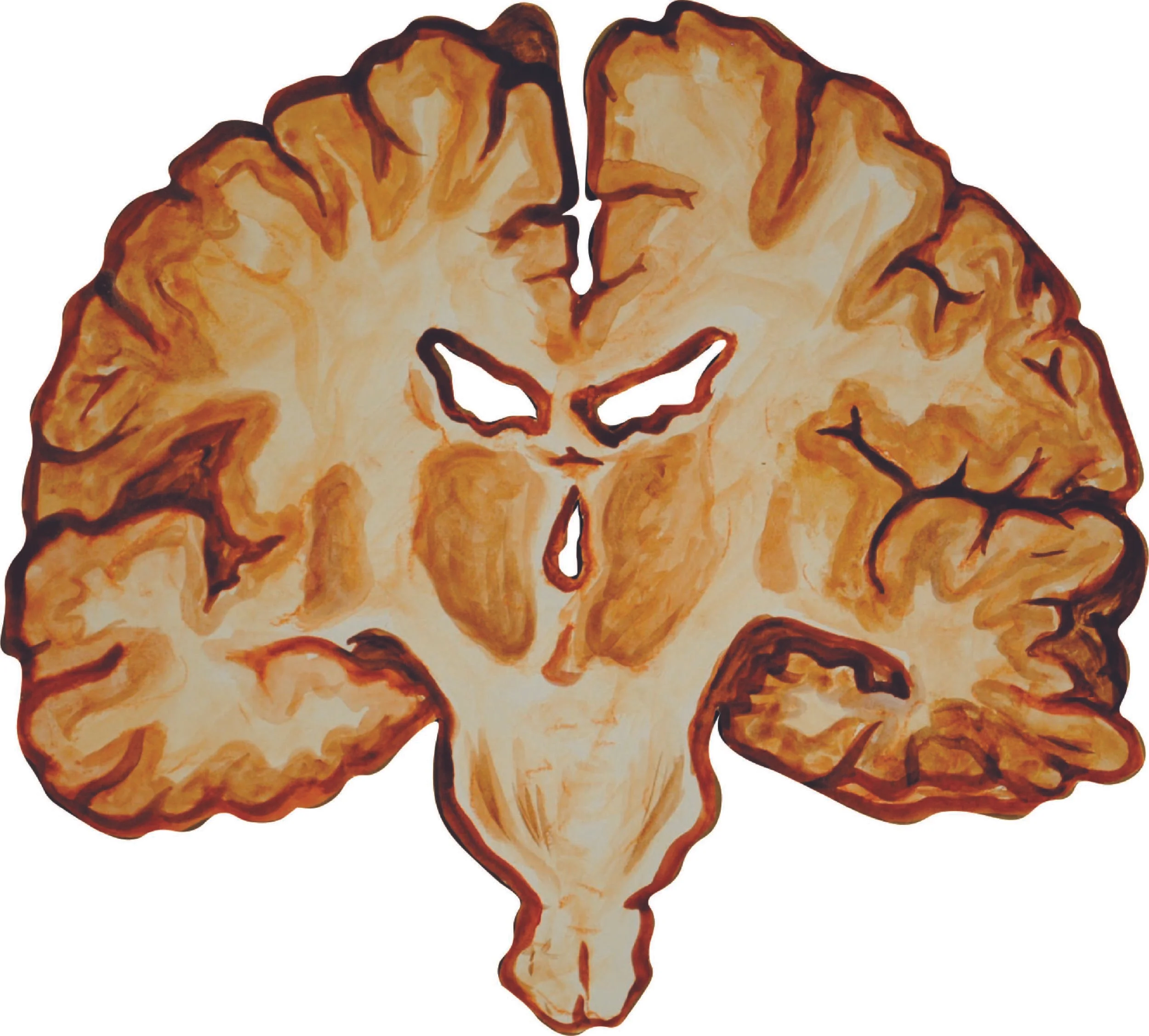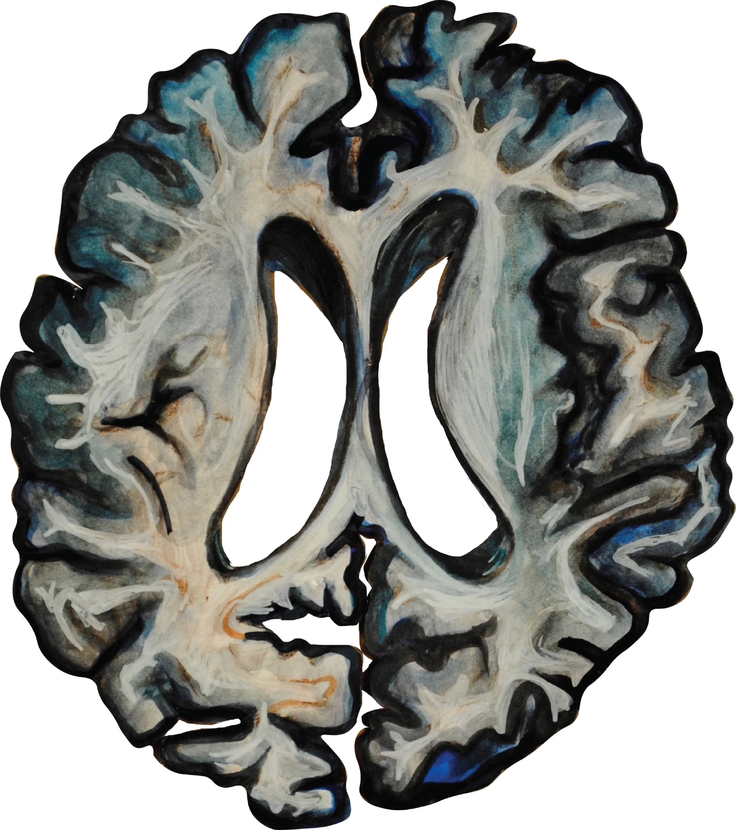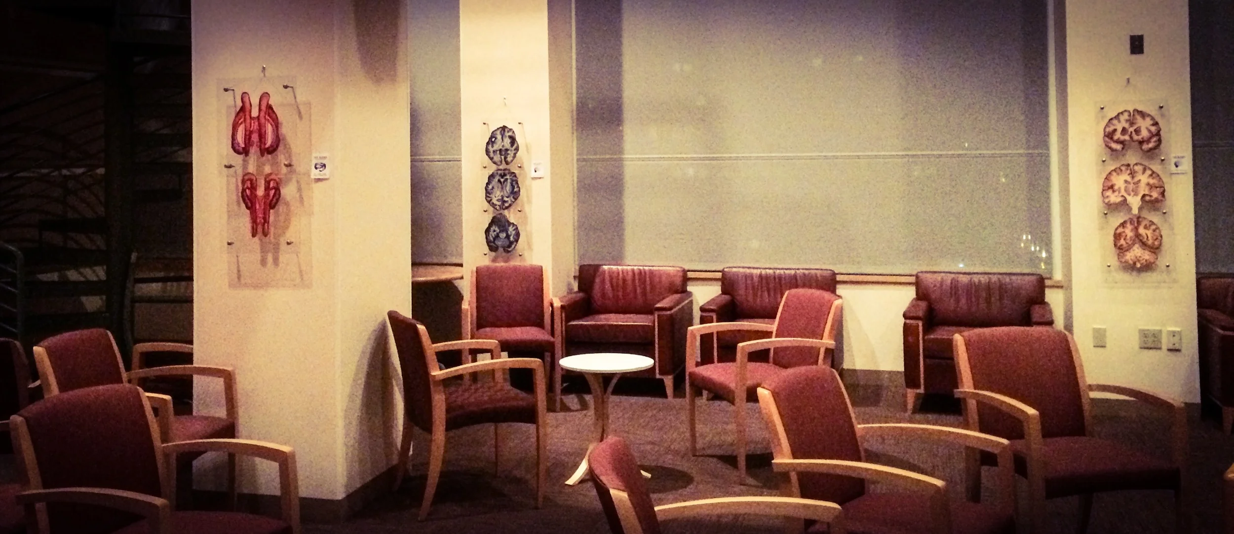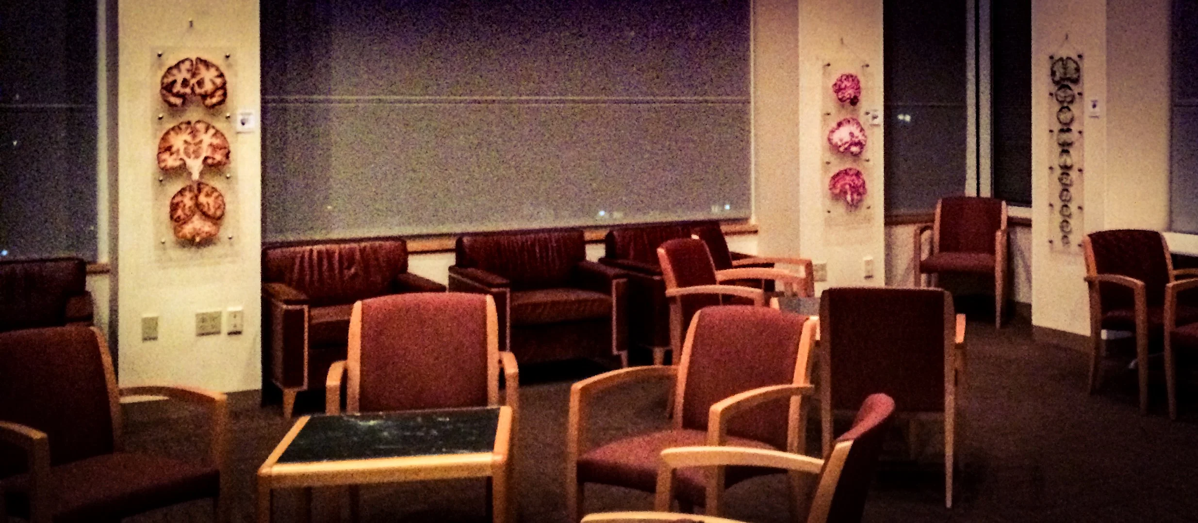 Auditorium, 4th Floor. A six set watercolor series focused on a particular brain region and anatomical planes framed and mounted in such a way to simulate microscope slides.