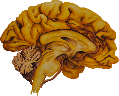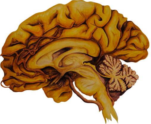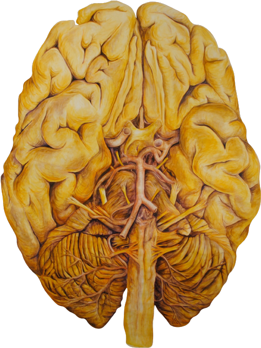 Scientists lack strong iconography, which is why I created this piece. The two sagittal views of the brain represent the sciences and the arts. The center brain in the inferior orientation represents the experience of the sciences, arts, and reality as a whole-- our view of which is always, by default, inferior.