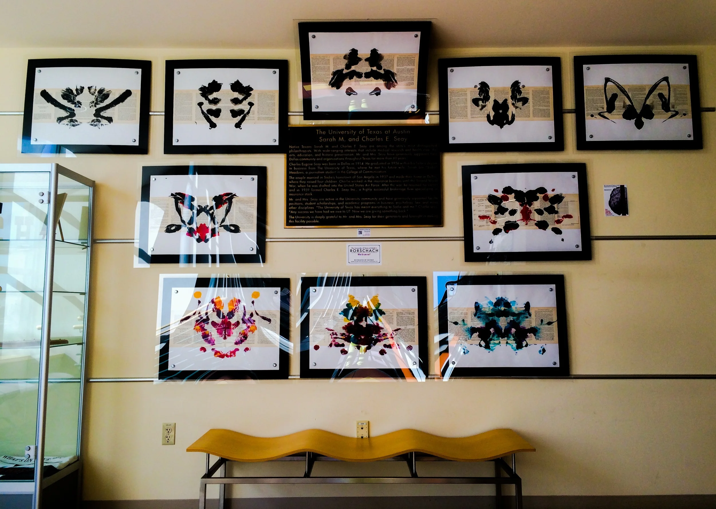 East Lobby, 2nd Floor at Staircase. Areproduction of a Rorschach projective test on sheets from the book Projective Psychology by Abt & Bellak, 1959. The test includes ten numbered inkblots that are bilaterally symmetrical. Five of the ten inkblots are black, two black and red, and three multicolor.